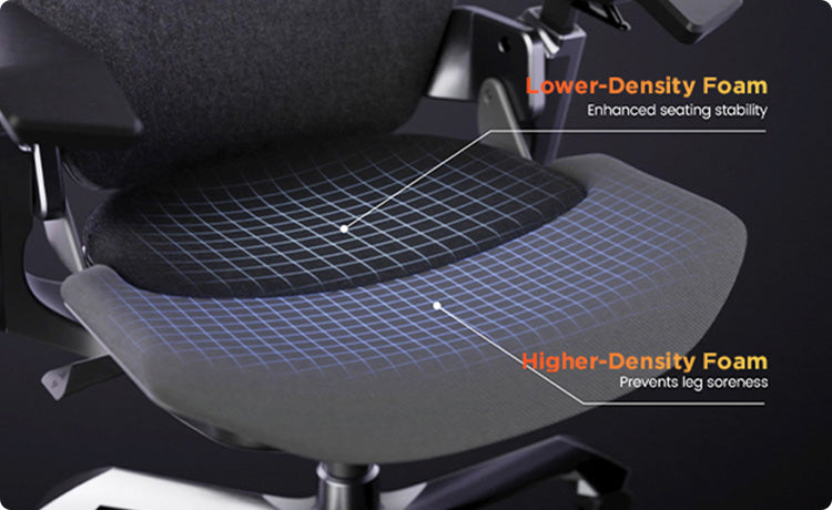 TGIF TO employs a segmented and pressure-relieving cushion with a dual-softness foam mix that adapts to the shape of the hip and thigh areas, providing smooth seating stability, preventing leg soreness, and maintaining resilience against sagging and deformation throughout the day.