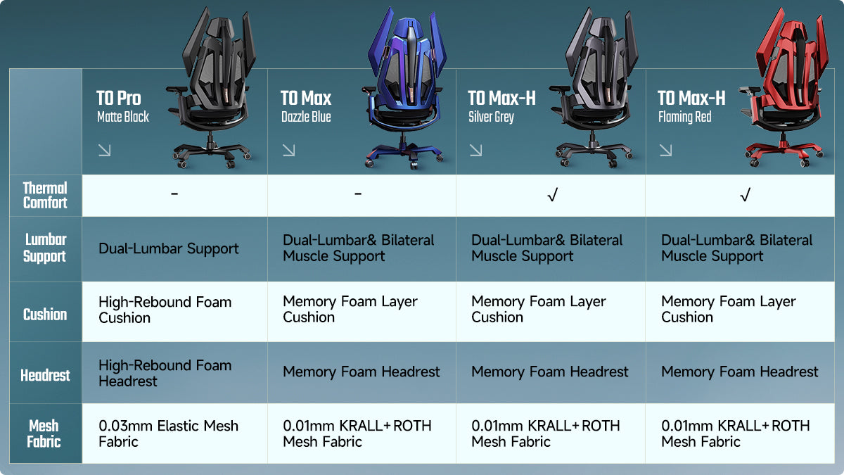 TGIF T0 Pro offers front lumbar support for the lower back and rear lumbar support for continuous additional support during reclining. T0 Max goes further with bilateral muscle support providing a 180° full-scale lumbar support.