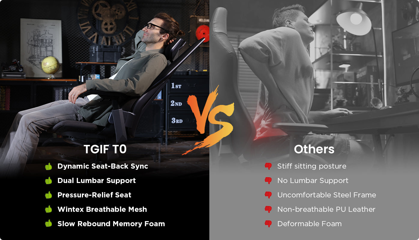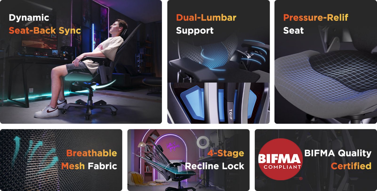 The TGIF T0 is the world’s first dynamic seat-back sync chair with lockable recline—no manual adjustments, no batteries required. It features bilateral muscle lumbar support and a segmented Pressure-Relief seat for balanced comfort.