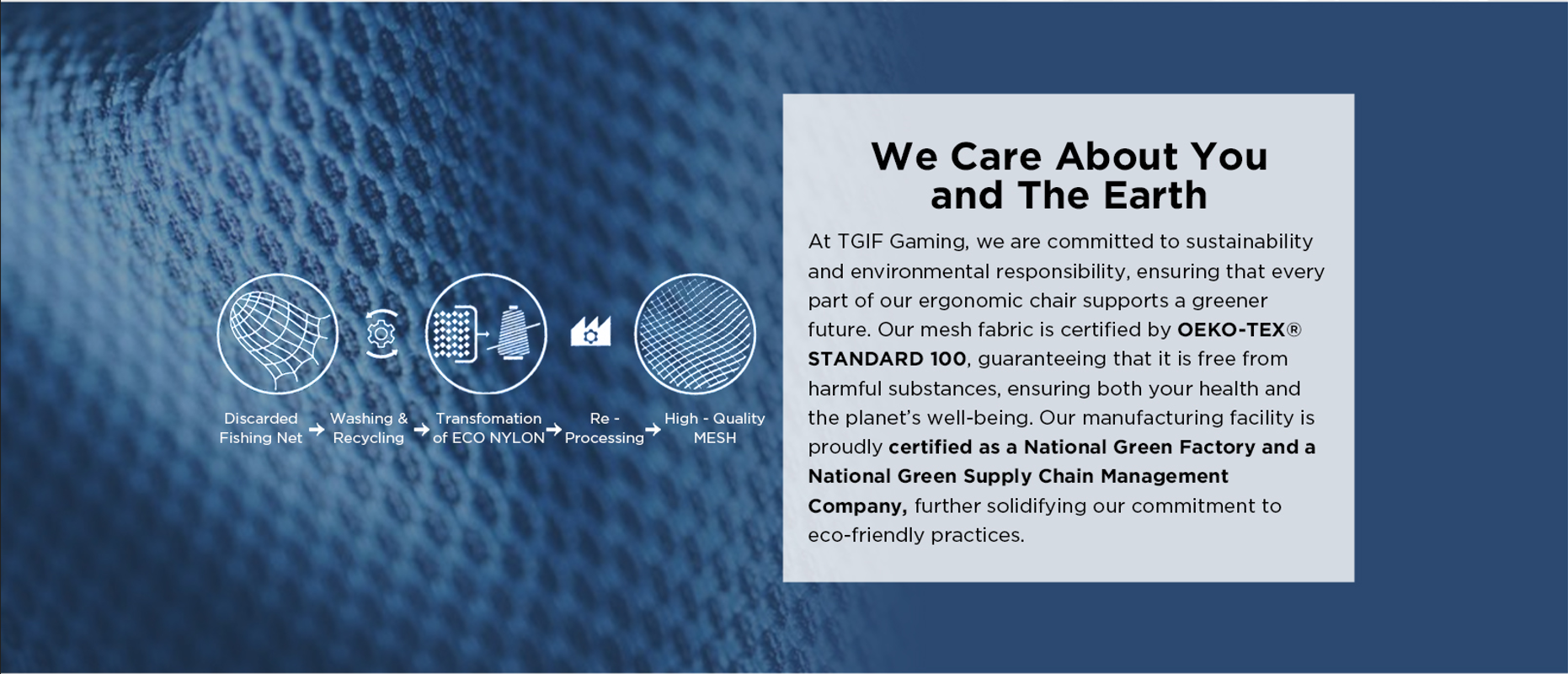 Additionally, we use recycled TPEE yarns, crafted from discarded materials collected throughout our production process. These recycled pellets, which are up to 70% recycled TPEE, are transformed into high-quality yarns, reducing waste and our environmental footprint. By choosing the TGIF ergonomic chair, you are investing in comfort, durability, and a greener future.